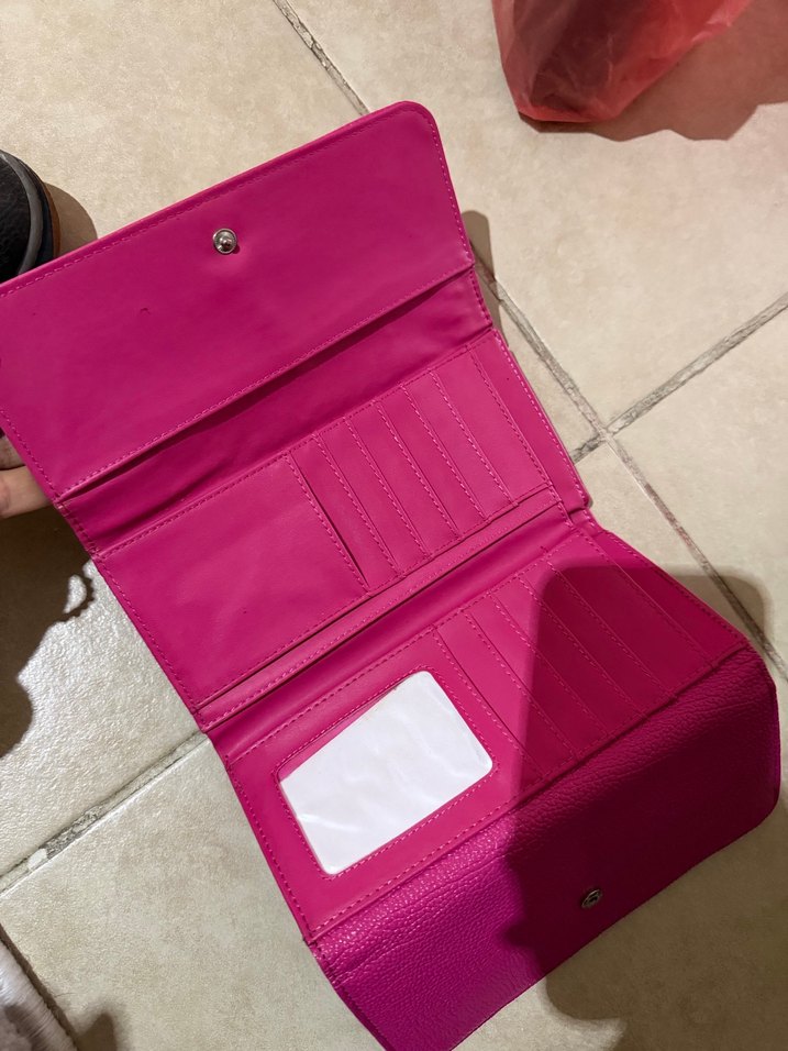 Parlak pembe renkte, fermuarlı tasarıma sahip, sentetik kumaştan yapılmış kadın portföy cüzdan. Çoklu kart yuvaları ve çağdaş stil sunar.