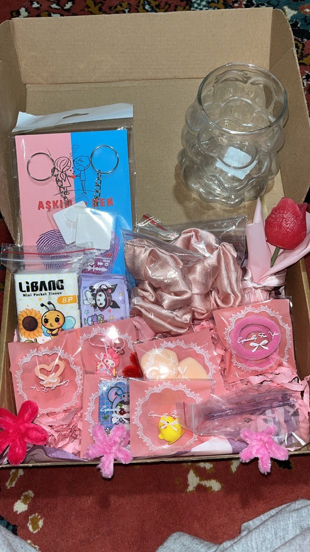Parlak ve pastel pembe renklerde, baskılı desenli genç kız aksesuar seti. "ASKI" yazılı çeşitli trend ürünler içerir.