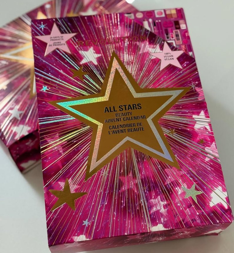 Parlak pembe renkte, "ALL STARS BEAUTY ADVENT CALENDAR" yazılı yıldız desenli güzellik advent takvimi. 24 gün sürpriz içerir ve vegan dostudur.