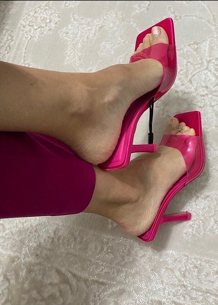 Parlak pembe renkte, ince topuklu kadın terlikleri, kauçuk malzemeden yapılmış, çağdaş ve desensiz tasarıma sahip, romantik randevu için uygun.