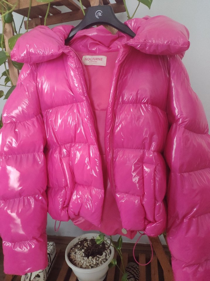 Parlak pembe sentetik kumaştan, askılı kollu ve halter yakalı, günlük kullanıma uygun, dar kesim kadın kışlık mont. ✨