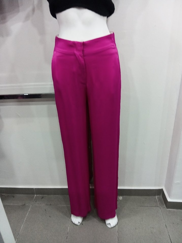 Parlak pembe, ipeksi kumaştan, midi boy, regular fit kadın kumaş pantolon. İş ortamına uygun, desen içermeyen, çağdaş ve etkileyici bir şıklık sunar.