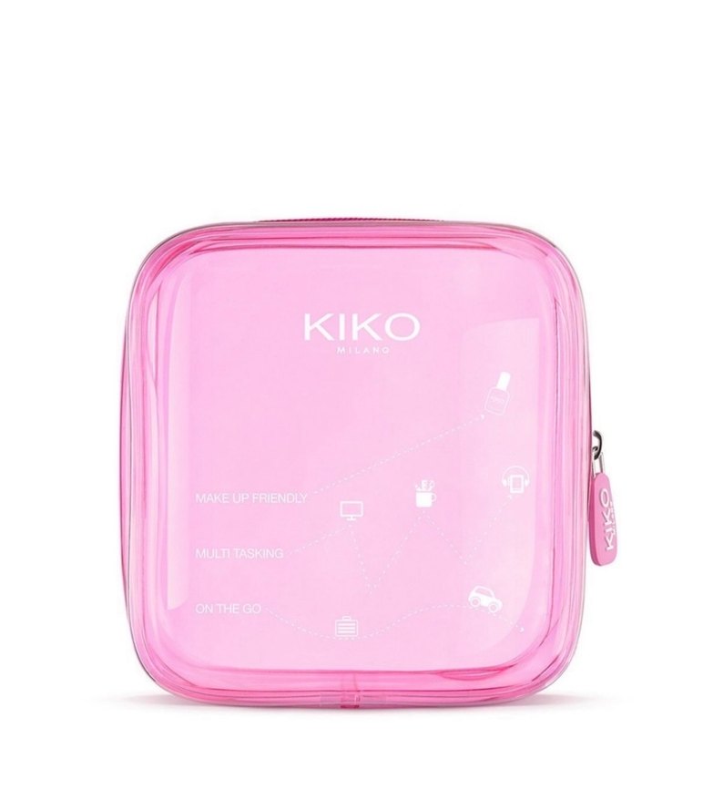 KIKO'nun pastel pembe makyaj çantası, parlak plastik malzemeden yapılmış, baskılı minimalist tasarıma sahip, günlük kullanım için uygundur.