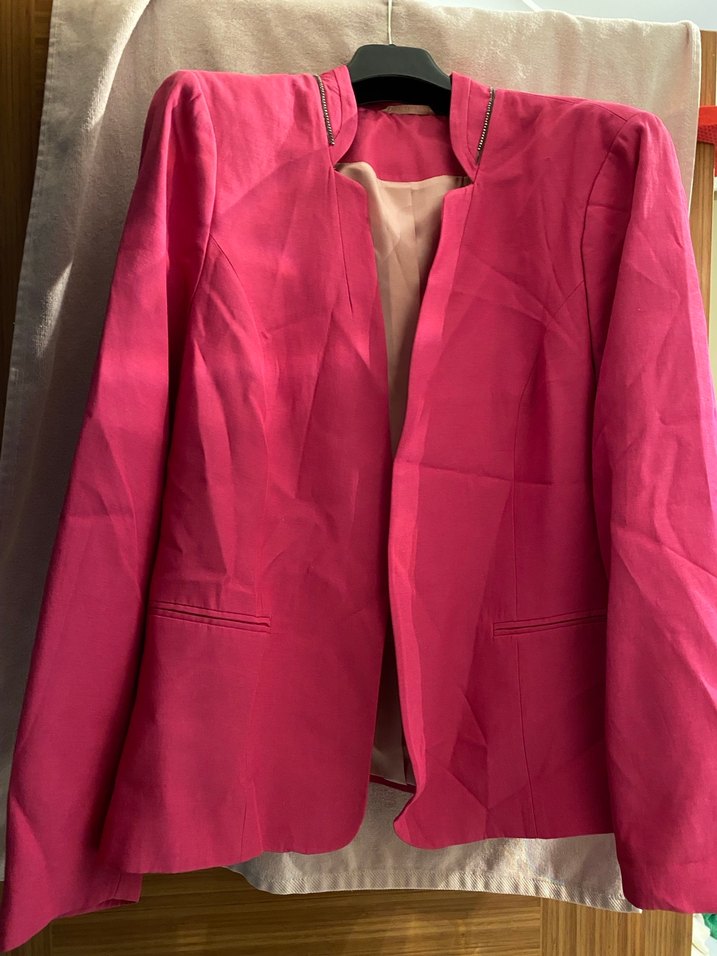 Parlak pembe renkli, ipek dokulu kadın blazer ceket. Uzun kollu, düğmeli ve normal kesimdir. Ofis için uygun midi boyda, keskin yaka detayı vardır. ✨