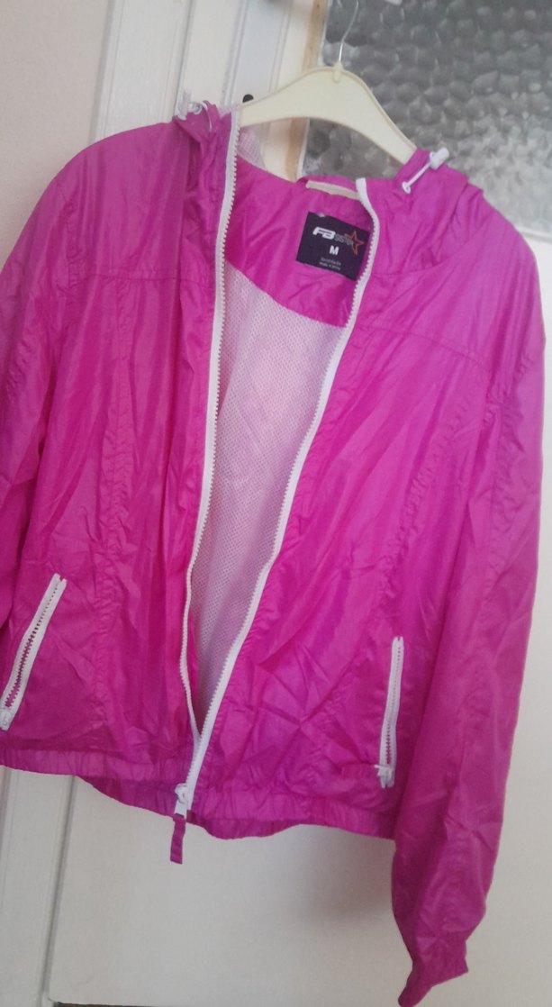 Parlak pembe renkte, fermuarlı ve cep detaylı, rahat kesim kadın spor ceket. Yaka tipi notched lapel ve askılı kollar ile günlük kullanıma uygun.