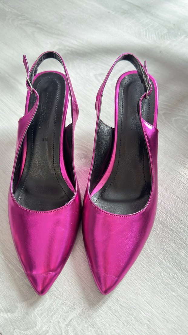 Kadın stiletto topuklu ayakkabılar, parlak pembe renk ve satenimsi dokuyla, tokalı kayışa sahiptir. Güncel tarzda, desen içermeyen tasarım romantik geceye uygundur.