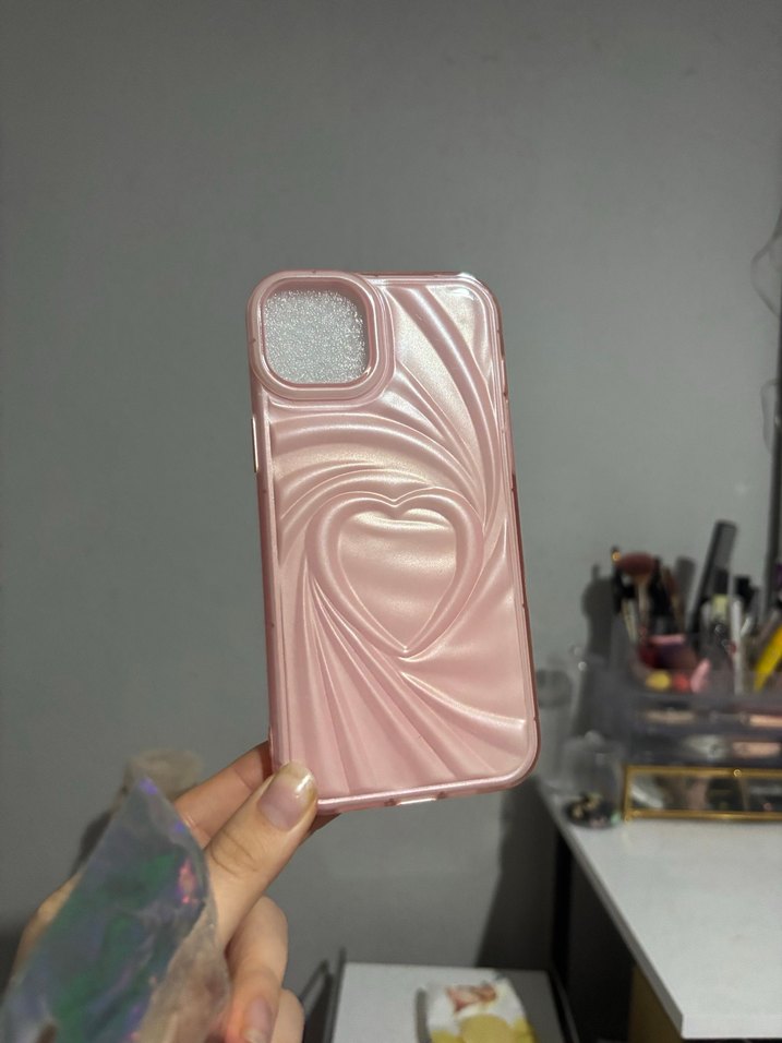 Parlak, pastel pembe renkte, çağdaş kalp desenli telefon kılıfı, şık koruma sağlar.