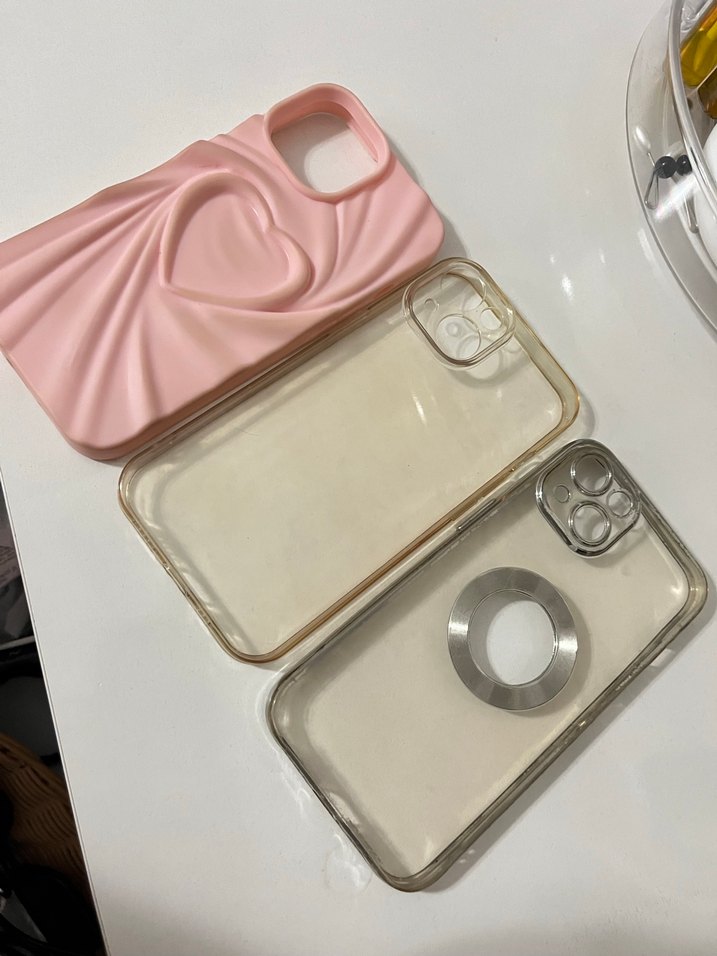 Parlak yüzeye sahip pembe telefon kılıfı, yükseltilmiş kalp detaylarıyla dikkat çekiyor. Telefon modellerine uygun kesimlere sahiptir.