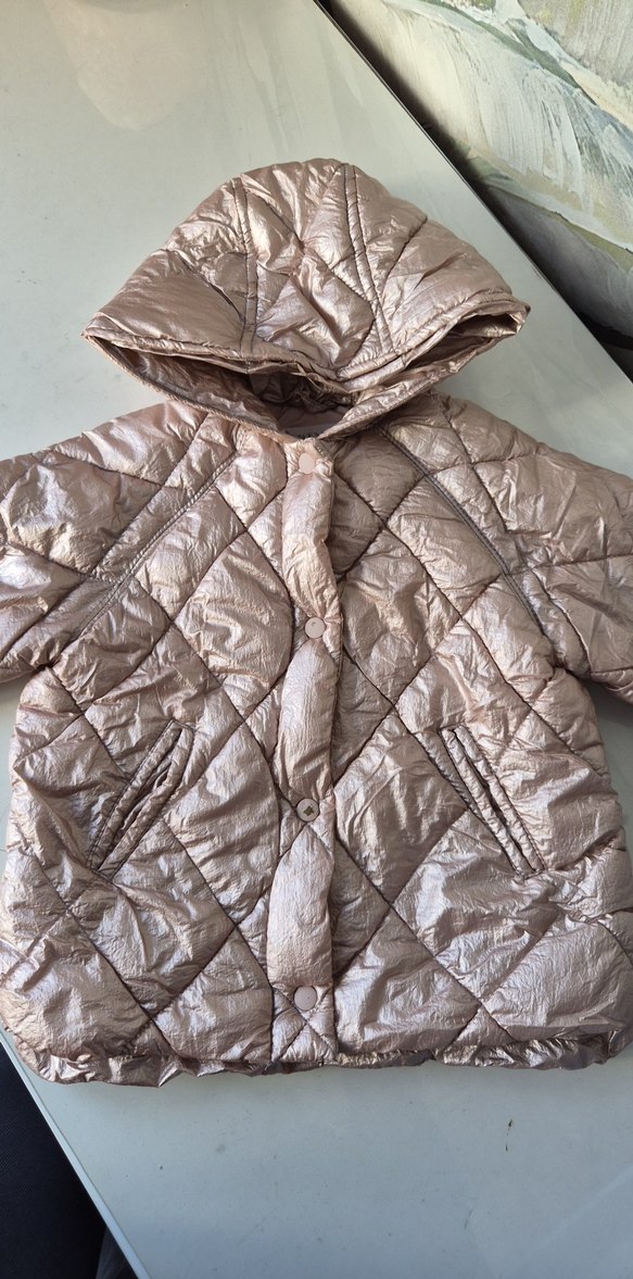 Parlak pembe renkli, düğmeli ve kapüşonlu kız montu.Düğmelerinde soyulma var sadece.