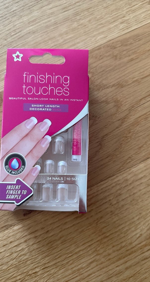 Parlak pembe renkte, 10 farklı boyutta 24 kısa takma tırnak içeren set. Hızlı salon görünümü için yapıştırıcı dahil.