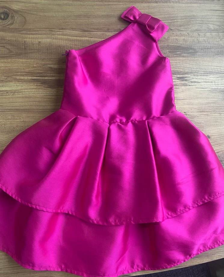 Pembe, parlak ve ipeksi kumaştan yapılmış, straplez yaka ve ince askılı kız çocuk elbisesi. Fırfır detayları ve çağdaş tarzı ile şık bir görünüm sunar. Bir kere düğünde giyildi, temiz, defosuzdur.