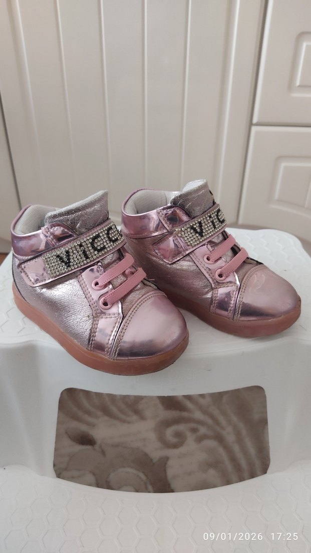 Parlak pembe renkli, baskılı desenli kız çocuk spor ayakkabısı. Kauçuk tabanlı, Velcro bantlı, sokak tarzı için uygun.