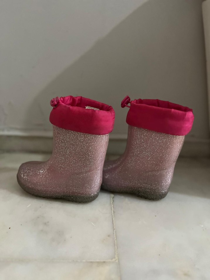 Pembe renkli, parlak simli kauçuk kız çocuk yağmur çizmeleri, yumuşak manşet detaylı, sokak modasına uygun.değişim iade yoktur. marka temsilidir.