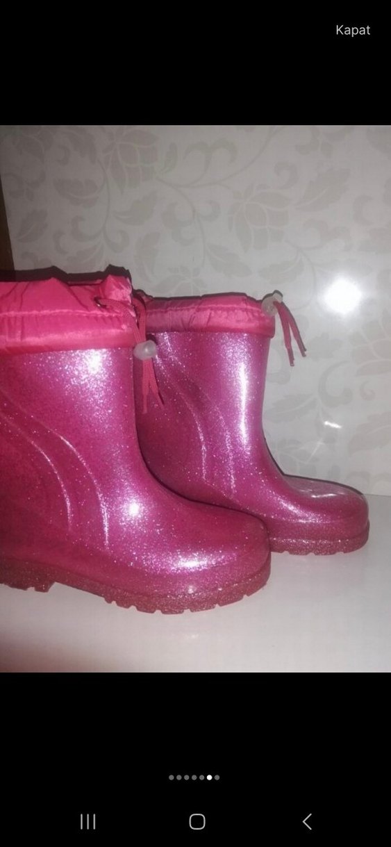 Pembe renkli, simli ve lastik malzemeden yapılmış kız çocuk yağmur çizmesi. Üst kısmı bağcıklı, desen içermeyen canlı bir tasarıma sahiptir.