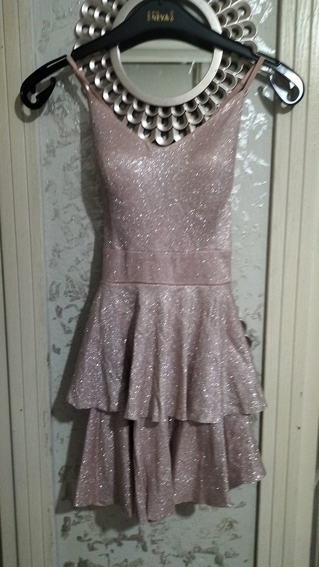 Parlak pembe kumaştan, V yakalı ve kolsuz kısa abiye elbise. Fırfırlı katmanlarıyla partiler için şık ve göz alıcıdır. ✨