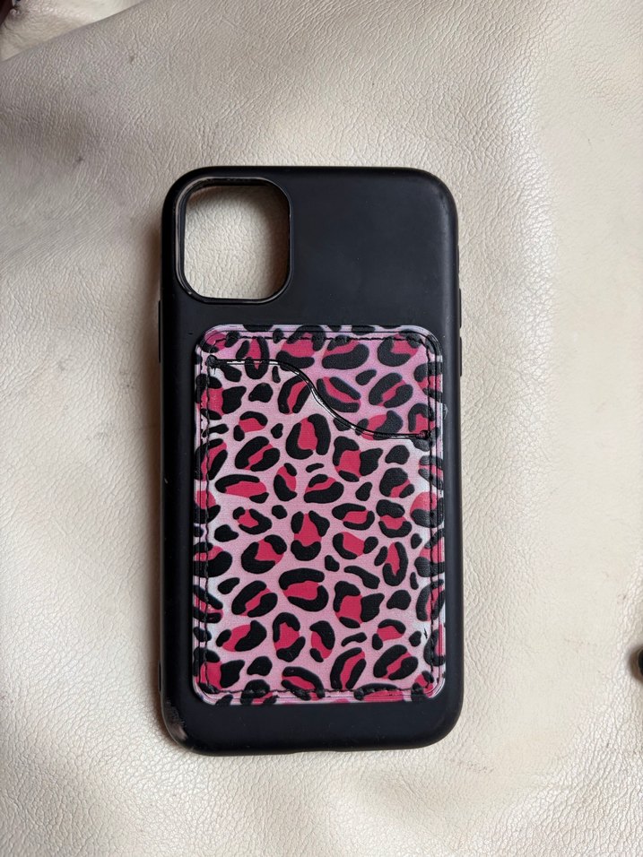 iphone 11 Parlak pembe leopar desenli kartlıklı koyu renk telefon kılıfı, pop kültür tarzında.