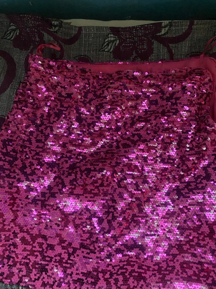 Parlak pembe, simli ve nakış işlemeli, dar kesim mini etek. Parti için göz alıcı bir seçim. ✨