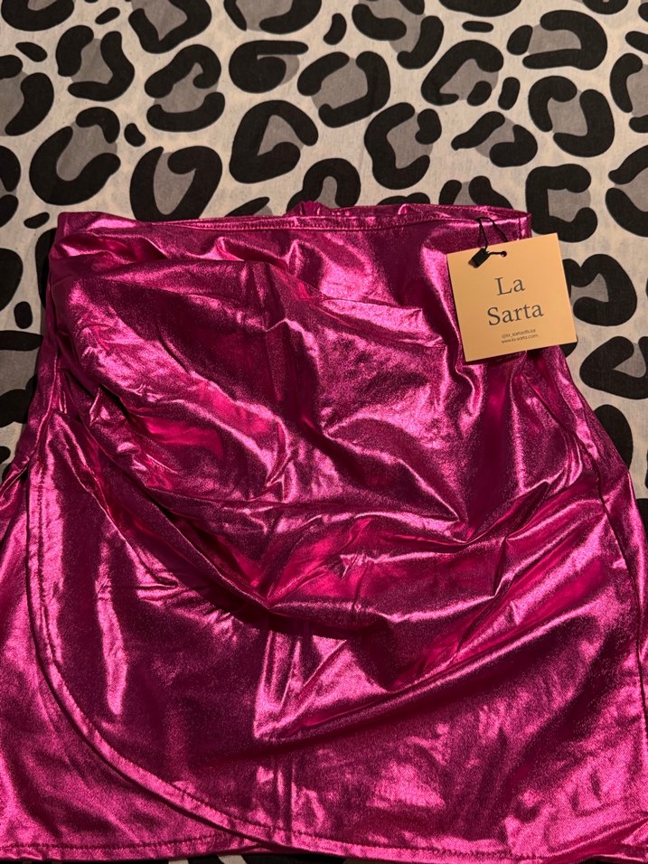 La Sarta marka parlak pembe mini etek, vücuda oturan kesimi ve parlak yüzeyi ile romantik gece ve şık sokak tarzına uygundur. ✨
