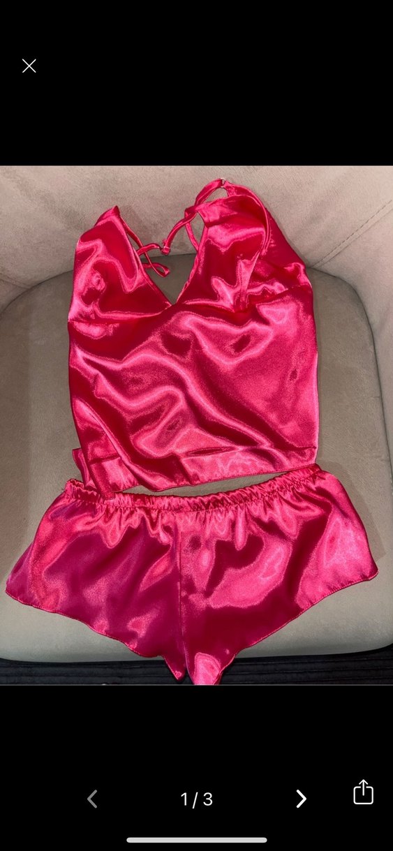 Parlak pembe mini ip askılı üst ve şortlardan oluşan, fit kesim kadın pijama takımı, ışıltılı ve şık bir tarz sunar.