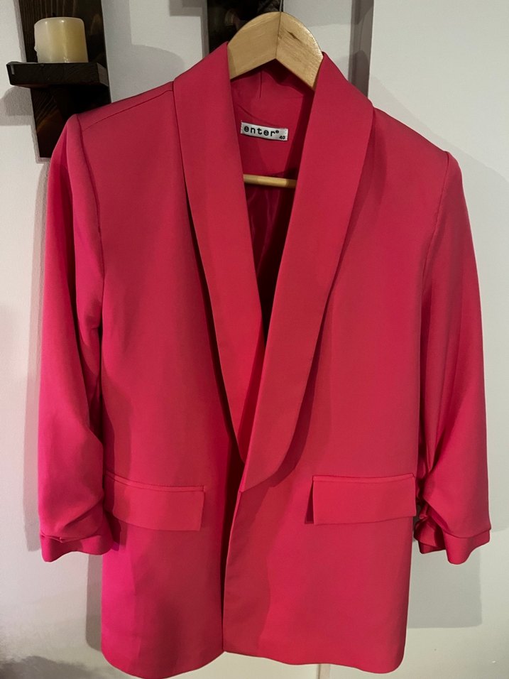 Parlak pembe, satenimsi kumaştan mini kadın blazer. Düğmeli, kesimli yaka ve kısa kol detaylarıyla ofise uygun, cesur bir tarz sunar.