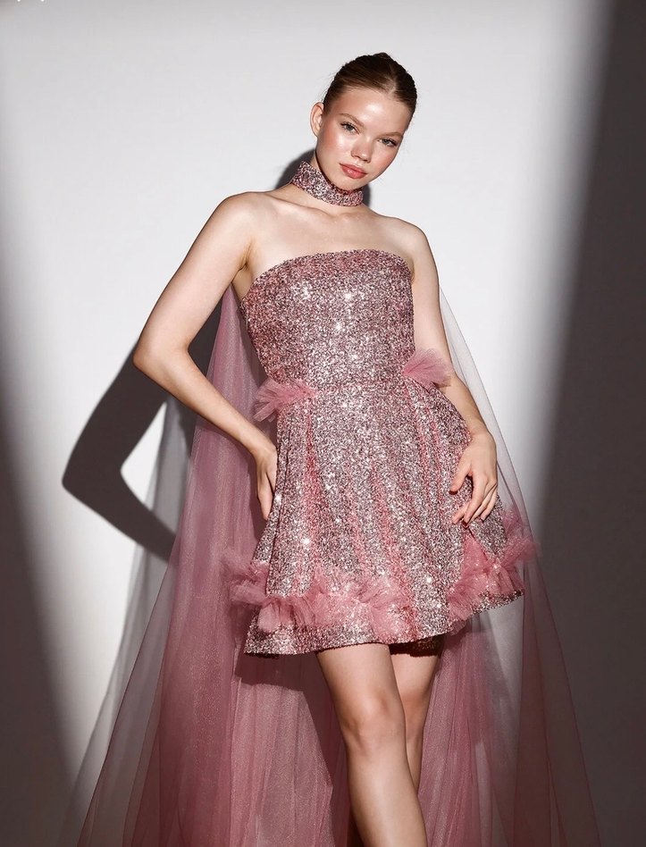 Parlak pembe sim ve nakış detaylı, straplez mini abiye elbise. Kolsuz tasarımı ve akışkan kuyruklu pelerin detayıyla göz alıcı bir parti stili sunar. ✨ Sadece after partimde 1 saat giydim. Temiz. Çok şık