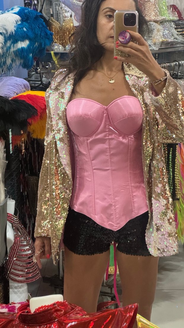 Tayland’da bir kostümcüde özel olarak dikildi. Pembe, straplez, mini uzunlukta ve parlak simli, satenimsi kumaştan yapılmış, vücuda oturan bustiyer. Cesur ve gösterişli sokak modası için ideal. ✨