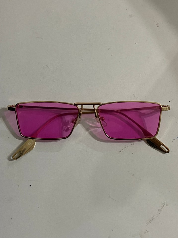 Parlak pembe renkli, altın tonlu çerçeveli, minimalist tasarımlı dikdörtgen kadın güneş gözlüğü, zahmetsiz şıklık sunar.
