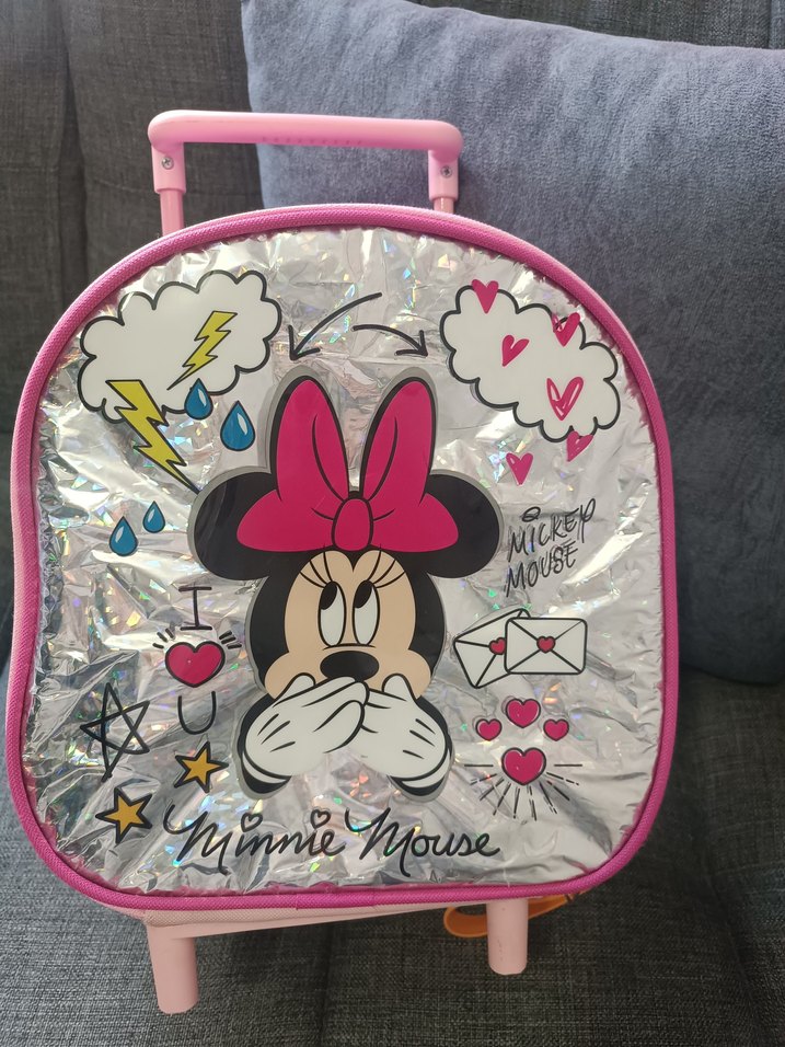 Parlak pembe renkte, Minnie Mouse ve eğlenceli çizimlerle süslenmiş çekçekli çocuk okul çantasıdır.