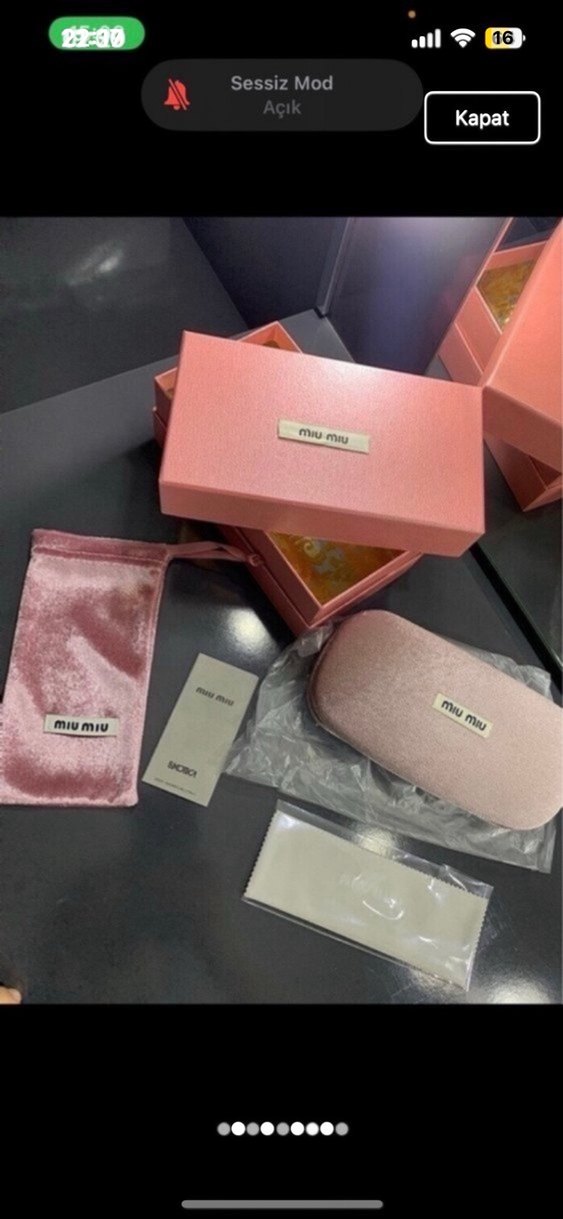 Parlak pastel pembe Miu Miu kadın gözlük kutusu, kadife kese, sert kılıf ve temizleme bezi içerir, çağdaş Paris tarzını yansıtır.