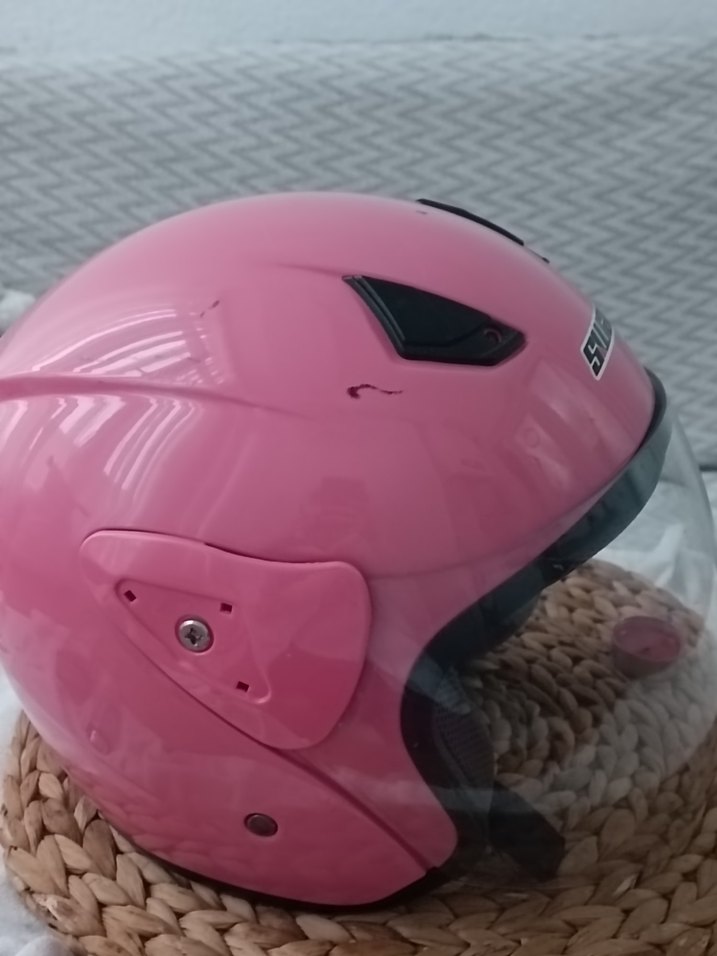 Parlak pembe renkte, dayanıklı plastikten yapılmış, sade ve desensiz motosiklet kaskı, şeffaf vizöre sahiptir. ️