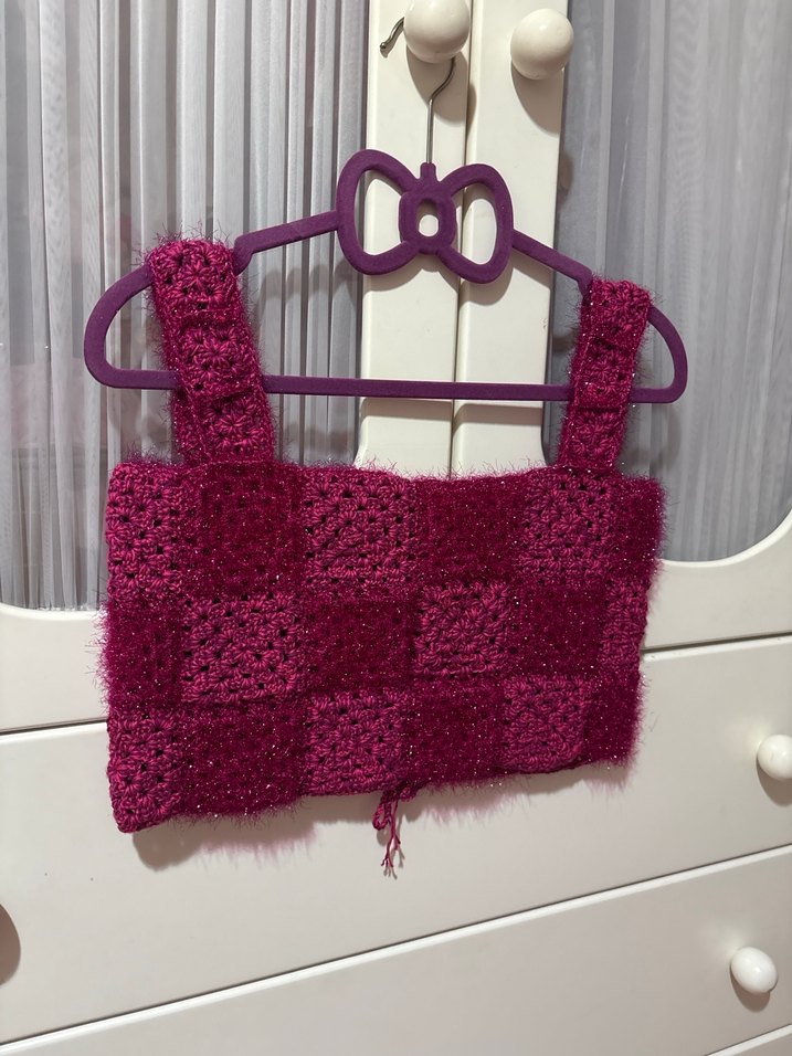 Parlak pembe örgü kumaştan yapılmış, geniş askılı ve straplez kesime sahip, dar kesim kız crop top. El emeği s m beden