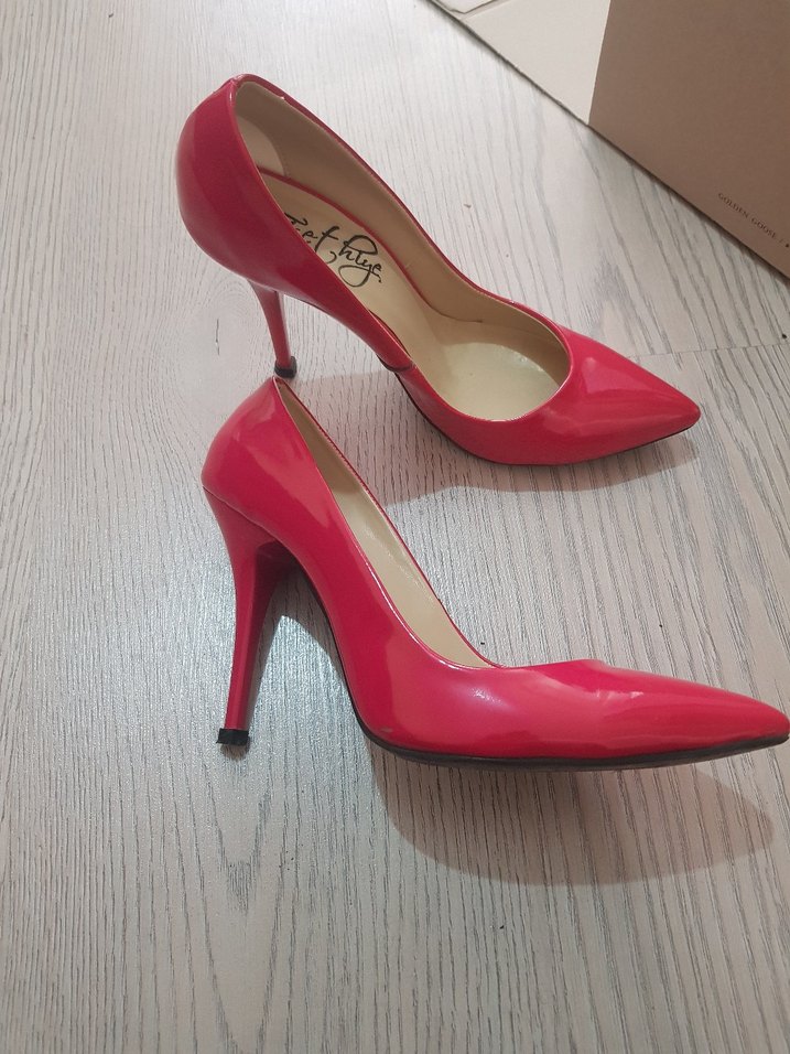 Parlak pembe renkte, baskılı desenli, kauçuk malzemeden yapılmış modern klasik stilettolar, günlük kullanım için uygundur.