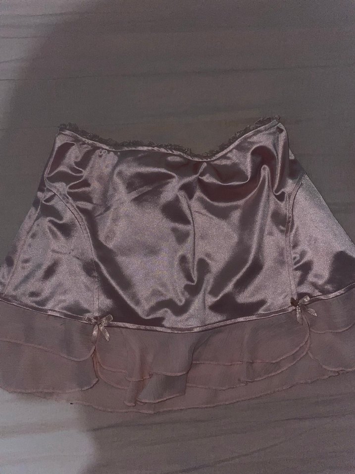 Parlak pembe saten kumaştan, fırfır detaylı, vücuda oturan mini etek, cesur parti tarzı için uygundur.