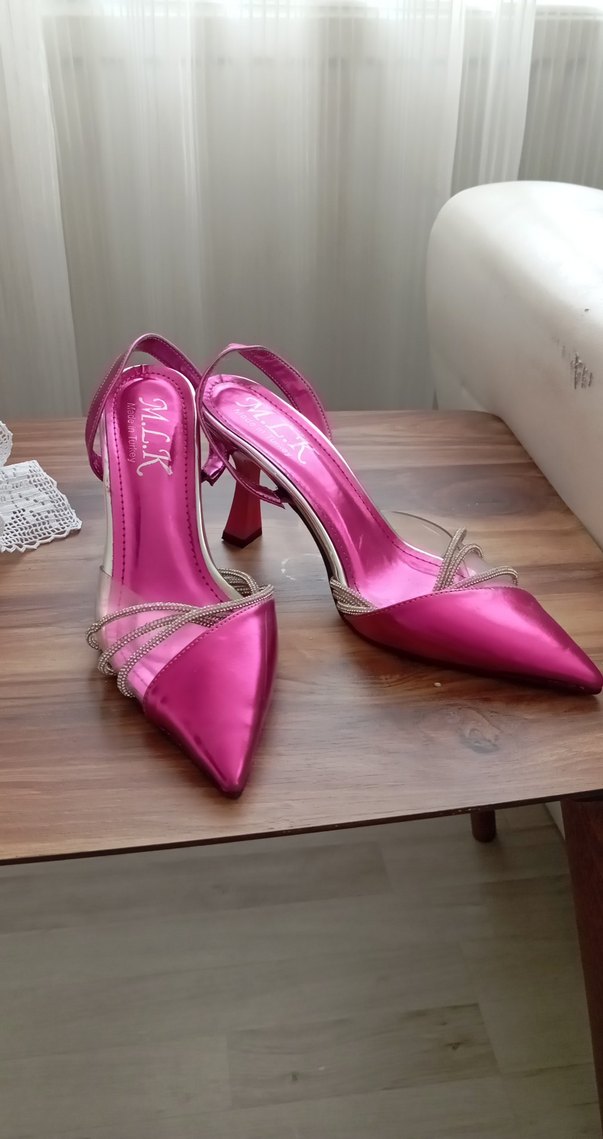 Parlak pembe stiletto topuklu, tokalı ve baskılı detaylı kauçuk malzemeden yapılmış kadın ayakkabısı. Düğün ve özel anlar için uygun. ✨