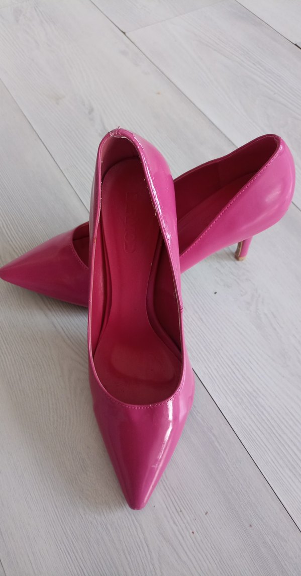 Parlak pembe renkte, lastik malzemeden yapılmış stiletto topuklu kadın ayakkabısı. Minimalist ve çağdaş tasarıma sahiptir. Romantik akşamlar için uygundur.