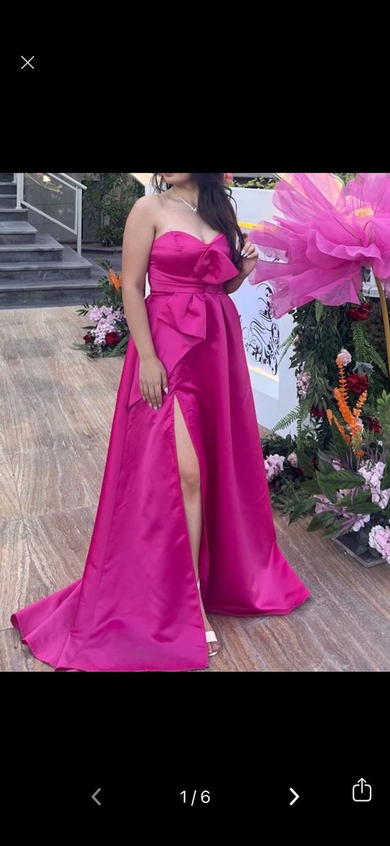 Parlak pembe kumaştan, straplez ve drapeli, bacak dekolteli, fit kesim uzun kadın abiye elbise.