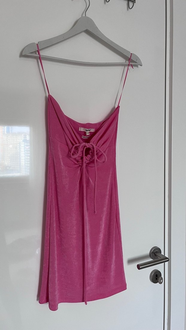 Parlak kumaştan, drapeli detaylı, straplez yakalı, pembe mini elbise. Romantik akşamlar için uygun, bohem tarzda.