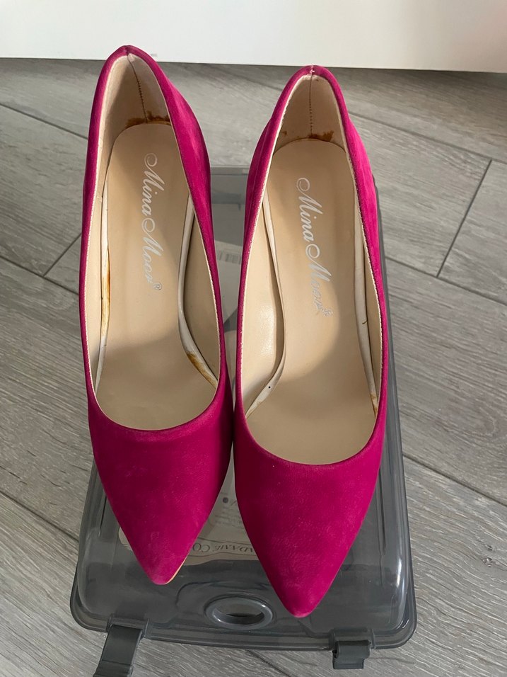 Parlak pembe süet stilettolar, klasik sivri burun ve minimalist modern tasarımla romantik akşamlar için şık bir seçimdir .Ayakkabı sadece ev içinde 2 kez giyilmiştir.