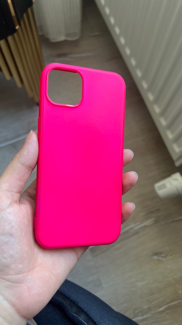Parlak pembe renkte telefon kılıfı. Cihazınızı korur ve renk katar. İPhone 13, 14, 15 uyumludur. Ufak bi soyulma mevcuttur kamera kısmında resimde görüldüğü gibi.