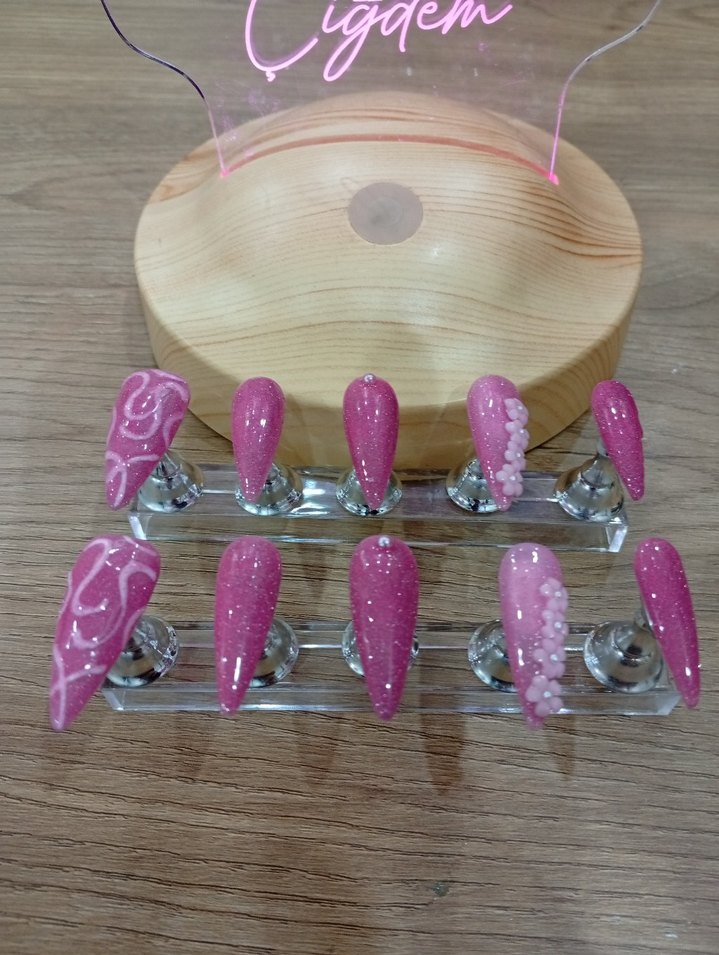 Parlak pembe tırnak süslemeleri, düz, desenli ve süslemeli tasarımlar içerir. Tırnaklara şık bir dokunuş katar.