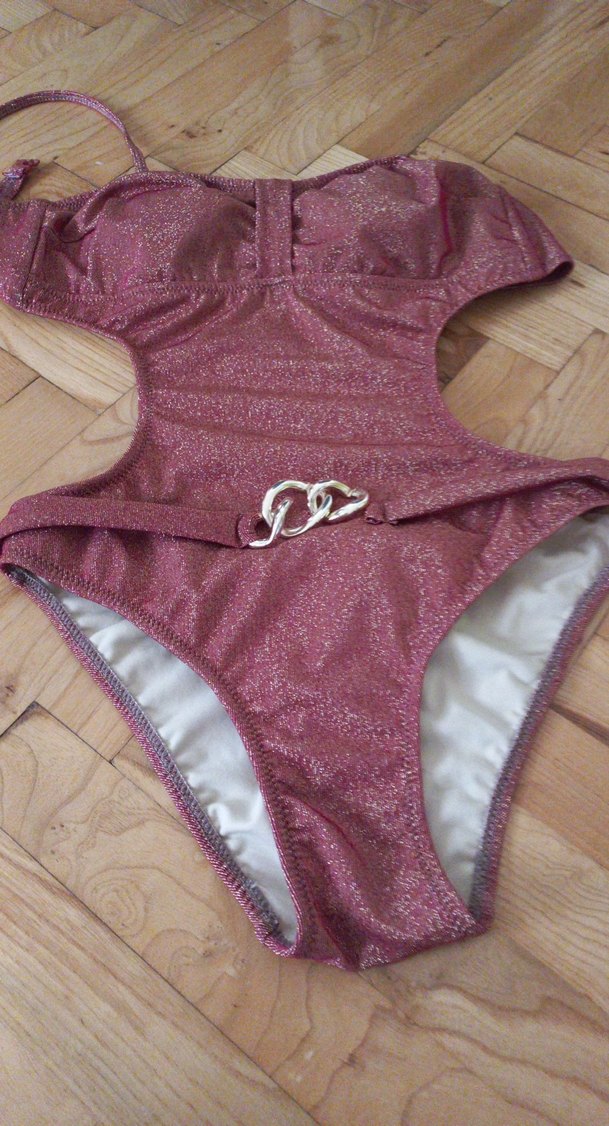 Parlak pembe kumaştan, askılı ve tokalı, vücuda oturan kadın mayo. Bohem stil ve plaj için uygun.