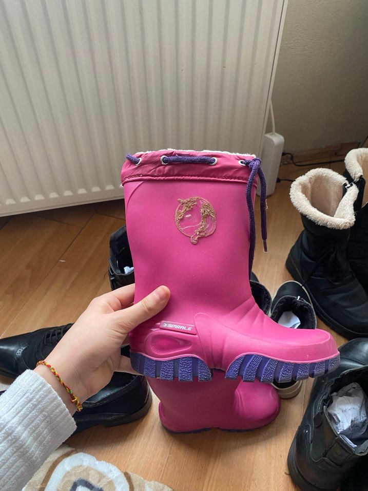Parlak pembe renkli kauçuk kız çizmesi, tokalı detaylarla sokak modasına uygun tasarlanmıştır.