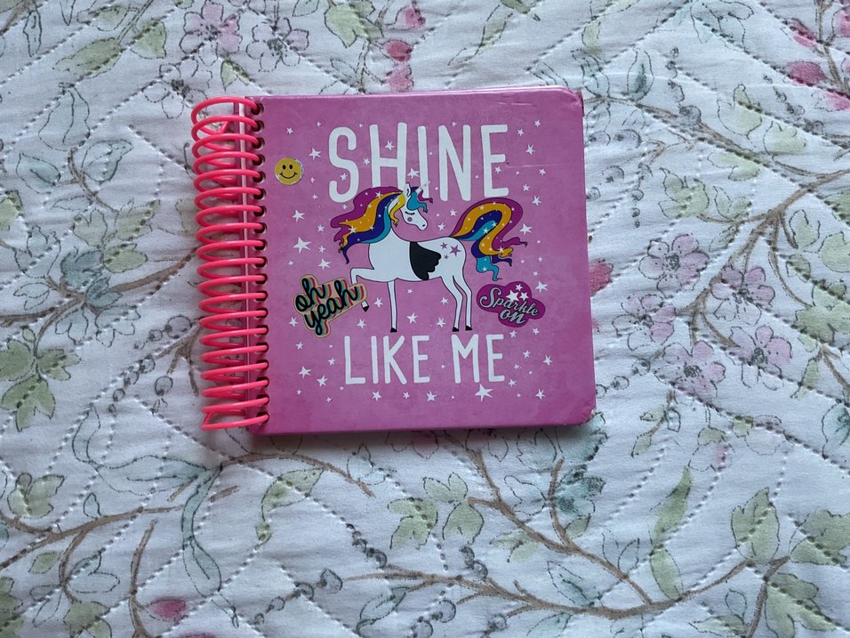 Parlak pembe renkte, renkli bir unicorn ve "SHINE LIKE ME" yazısı bulunan spiral bağlamalı defter.