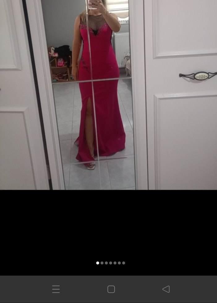 Parlak pembe renkte, uzun ve vücuda oturan abiye elbise. Yırtmaçlı ve askılı yakasıyla cesur, ışıltılı bir görünüm sunar.1 kez giyildi