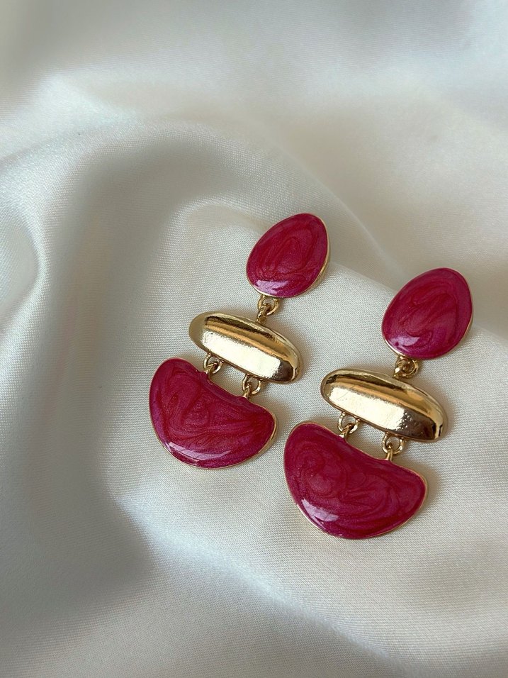 Parlak pembe, renkli soyut desenli ve altın detaylı uzun bohem küpeler, cesur ve göz alıcı bir görünüm sağlar.