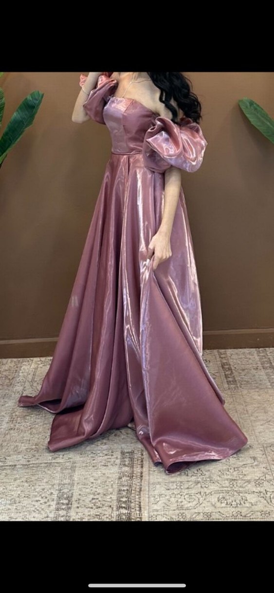Parlak pembe kumaştan, uzun ve bol kesim drapeli elbise. Kayık yaka ve askılı kollara sahip, modern klasik tarzda, düğünler için uygun. kolları çıkabiliyor