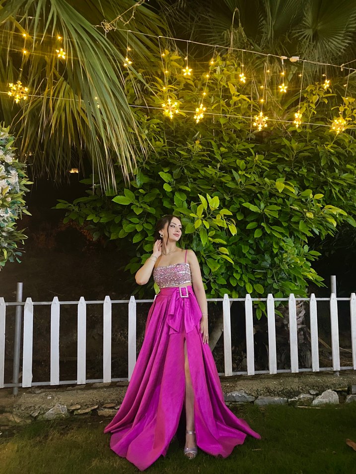 Parlak pembe renkte, drapeli ve straplez yaka detaylı uzun abiye. Salaş kesimi ve çağdaş tarzıyla gösterişli düğünler için uygundur. ✨