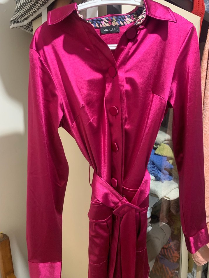 Uzun kollu, parlak pembe kumaştan, düğmeli ve belde kuşaklı, Paris tarzı sokak modası esintili, vücuda oturan kadın elbisesi.