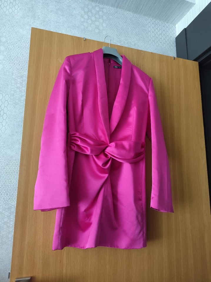 Parlak pembe renkte, uzun boy ve normal kesim kadın sabahlığı. Uzun kollu ve Paris tarzında, desensiz şık bir tasarıma sahip.