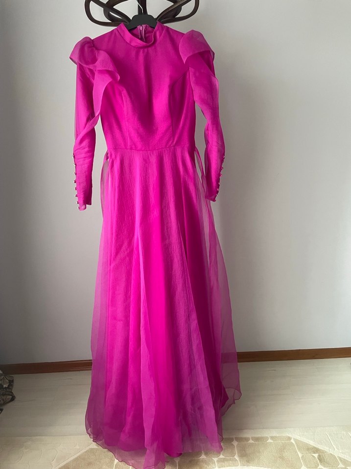 Parlak pembe kumaştan, yüksek yakalı ve uzun kollu, drapeli tasarıma sahip, modern klasik ve vintage tarzı harmanlayan, düğünler için uygun dar kesim kadın elbisesi.